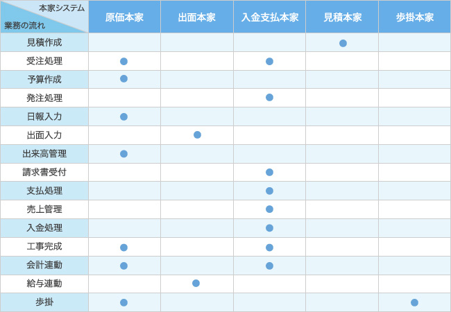基本の本家シリーズ(原価、出面、入金支払、見積)と組み合せて使用するシステムです。オプションを業務別に選択し、本来やりたかった事が可能になるサブ本家シリーズです。